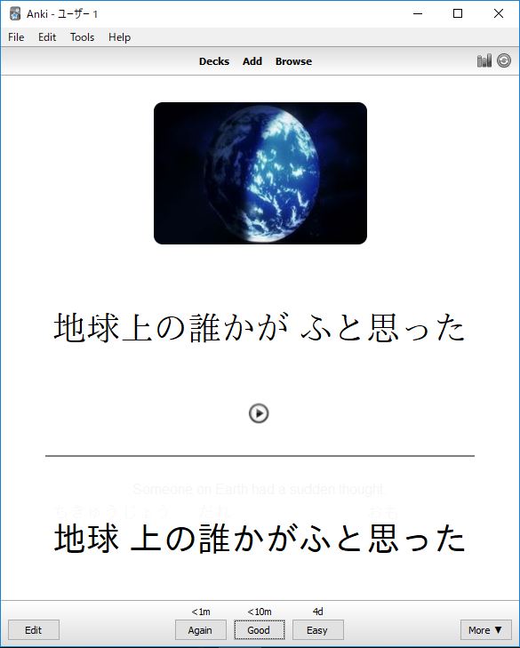Thanks so much to the generous person who made and submitted this deck. This is the complete series of 寄生獣セイの格率 (episodes 1-24) expanding 5850 cards. This deck not only includes images, audio, and English translation, but has some really really super cool CSS styling to the cards. You can't see it in the screenshot, but there is a hover-over hide/show translation and reading feature that is the most awesomeness thing I have ever seen since sliced bread. I would love to incorporate this feature into all my decks in the future.